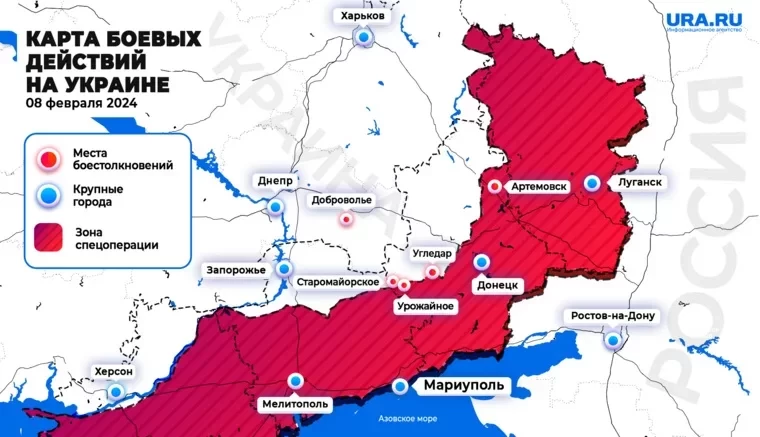 Обновлённая карта боевых действий на Украине по данным на 12:00 мск сегодня, 08.02.2024: оперативная сводка