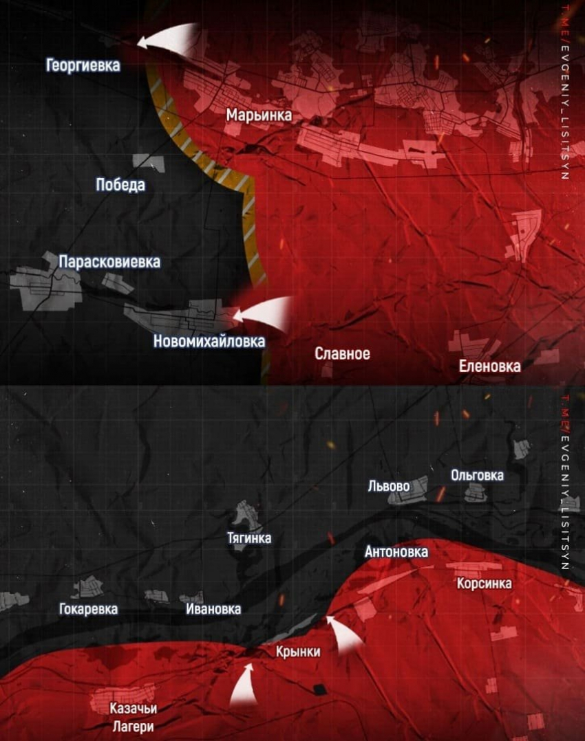 Восточная часть Новомихайловки под наступлением российских войск, мы закрепились на восточной окраине улицы Мира. Ожесточенные бои в районе Победы и севернее Никольского. Снабжение украинских формирований через Константиновку и Парасковиевку пока не перерезано, но в скором времени будет перерезано, пишет в Telegram-канале военкор Евгений Лисицын.