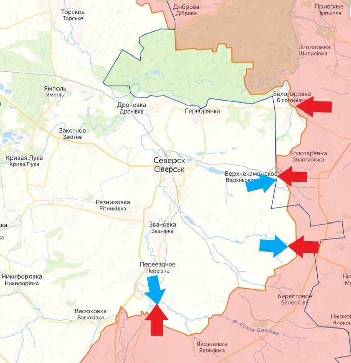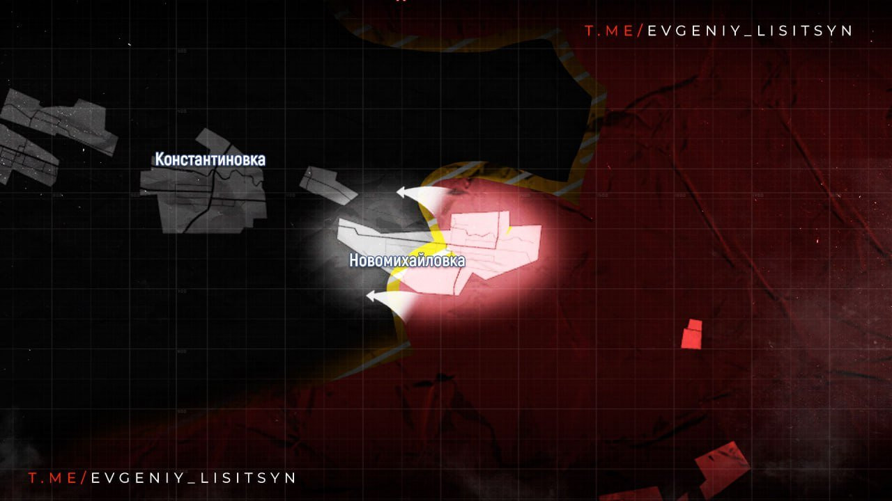 На Донецком направлении в районе Новомихайловки российские войска предпринимают попытки обхода украинских позиций с северной и южной сторон, что может поставить украинский гарнизон в трудное положение в случае успеха манёвра.