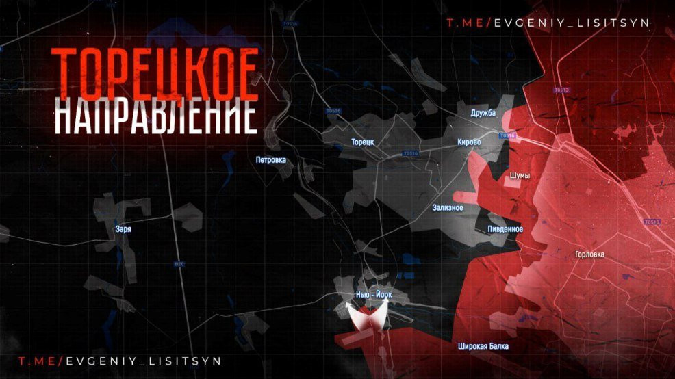 На Торецком направлении для ВСУ картина все печальнее с каждым днём. Наши войска продолжают идти вперёд, обрушаю фронт противника. В н.п. Новгородское (Нью-Йорк) наши бойцы полностью выбили противника из южной его части и продвинулись в центре населенного пункта до Балки Железная, взяли под контроль территорию машиностроительного завода и закрепились в гаражном кооперативе в районе Петровской Горы. Об этом в своем Telegram-канале сообщает военкор Евгений Лисицын.