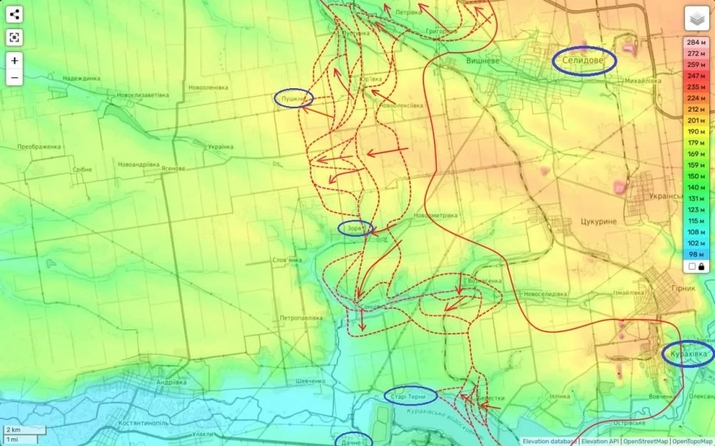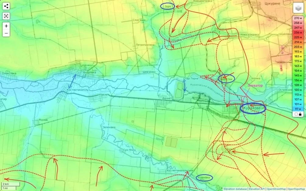 В районе самого Курахово бои продолжаются в двух ключевых локациях. Первая из них - это так называемый мешок вдоль реки Сухие Ялы. Эта ситуация затянулась, и наши части сознательно не закрывают его полностью, предоставляя украинским войскам возможность отойти с рубежей. Как показывает практика, полное окружение противника в таких условиях хоть и лишает его шансов на прорыв, но значительно замедляет ход нашей наступательной операции. Это важно для нас: мы продолжаем поджимать противника «по стенкам» полукотла, подталкивая его к отходу. В результате этого он рискует потерять значительное количество своих солдат и оставить в мешке всю свою технику.