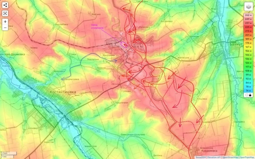 Сама Константиновка очень компактный город с высотной застройкой, но находящийся в низине. Занятие здесь высот, даст нам очевидное преимущество не только в вопросе визуального контроля города, но и в возможности работать дронщикам на большую глубину (по тылам ВСУ). Об этом Юрий Подоляка пишет в своем Telegram-канале.