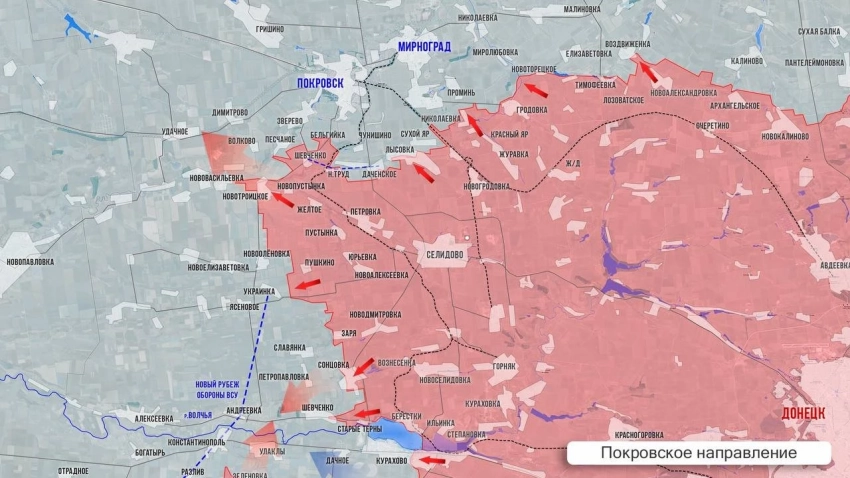 На Покровском фронте МО заявило об освобождении села Новый Труд. Ресурсы противника сообщают, что армия России практически освободила соседнее Даченское. ВСУ сохраняют присутствие на восточных окраинах, ближних к Лысовке, где наши усилили натиск. Западнее наши бойцы штурмуют Песчаное от которого вышли к северным окраинам Волково. Упорные бои идут по линии Волково-Соленое-Нововасилевка. Между Нововасилевкой и Новоелизаветовкой штурмовики продвинулись широким фронтом на глубину от 1 до 3 км. Со стороны Новоленовки - ВС РФ мощно продвинулись в направлении Украинки. Значительную территорию взяли под контроль северо-западнее Зари - это позволит выйти в тыл гарнизонам в Славянке и Украинке. Упорнейшие столкновения в районе Сонцовки и Петропавловки за выход к трассе на Андреевку.