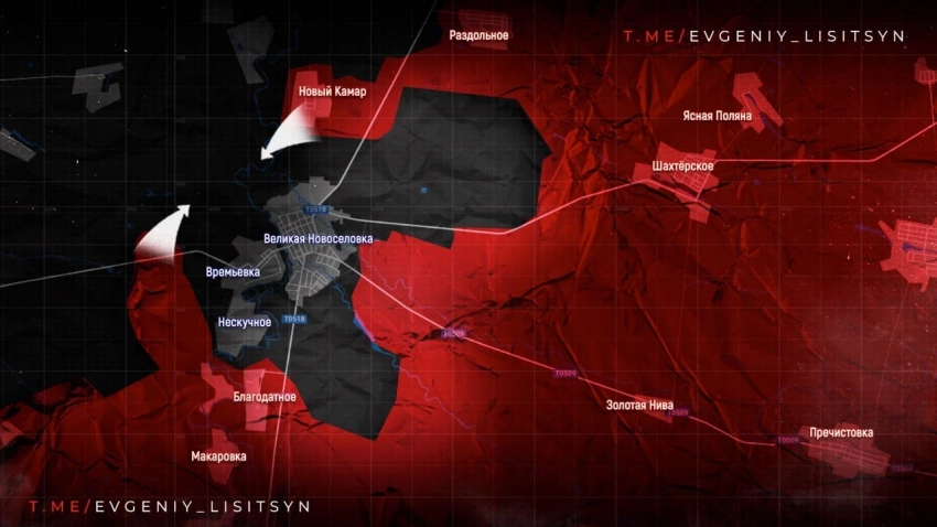 ВеликоНовоселовское направление. Наши парни перерезали дорогу Гуляйполе - Запорожье, что означает практически полное окружение Великой Новоселки. Теперь группировка ВСУ в селе может снабжаться только через грунтовые дороги, что, учитывая погоду, сделать очень непросто.