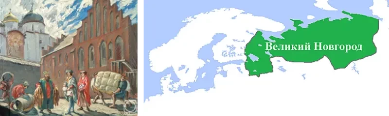 На изображении слева картина Г. Добровольской «Великий Новгород». Справа — карта территории Великого Новгорода. Не надо думать, что это был всего лишь один город — его восточная граница простиралась до самых Уральских гор...