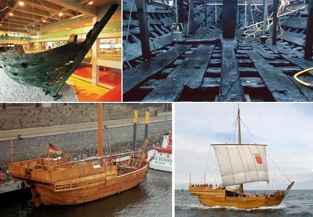 «Бременский когг» — наиболее сохранившееся средневековое торговое судно в мире. Во время работ по расширению гавани в 1962 году на реке Везер (Германия) был обнаружен ганзейский ког из Бремена, что для всего мира стало сенсацией. Фото сверху: поднятый со дна и восстановленный когг. Хорошо видны обгорелые элементы конструкции. Источник: Немецкий морской музей (DSM). Это единственный оставшийся, относительно хорошо сохранившийся обломок корабля, который отображает североевропейское судостроение, ибо ранее суда с похожим внешним видом были известны только по изображениям на старых печатях ганзейских городов. Фото снизу: реплика «Бременского когга». Внутри корабль был заполнен древесным углем, что является признаком мощного пожара, который заставил корабль пойти ко дну. Фото: Фолькер Грис.