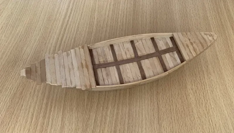 Стойки навеса вытачиваются из подходящих по толщине деревянных брусков, а сами опоры тента можно сделать из сточенных до половины пластмассовых бусинок. Лопасти рулевых весел – из палочек-лопаток для мороженого, веретено весел – китайские зубочистки.