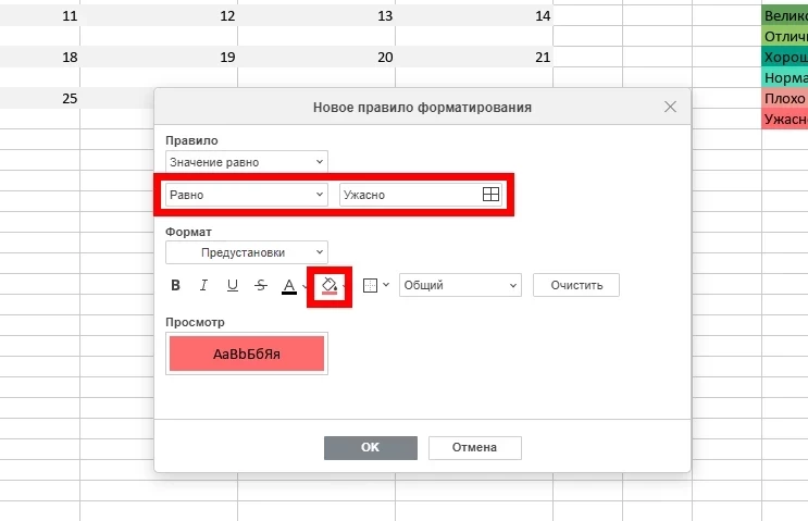 • Введите первое значение из списка (например, «Ужасно») и выберите соответствующую заливку (например, красную).