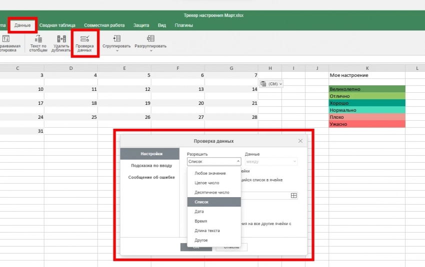 • Теперь при нажатии на ячейку появится выпадающий список с вариантами настроения.