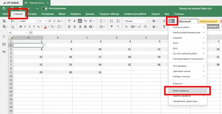 • Перейдите в «Главная» → «Условное форматирование» → «Новое правило».