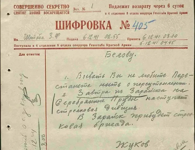 Шифровка Жукова, направленная командиру 1 гв.кк П.А. Белову