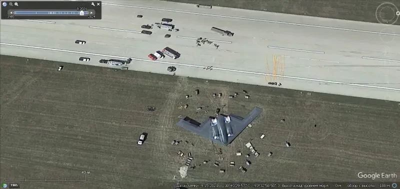 Спутниковый снимок Gооglе Еarth: бомбардировщик В-2А выкатившийся за пределы ВПП