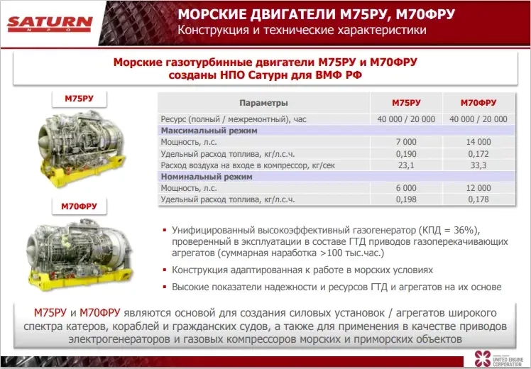 Мы в едином порыве осуждаем длительный процесс ремоторизации на Су-57 и посыпаем головы пеплом из-за переносов вправо сроков создания двигателей для гражданской авиации России и тут же готовы вставить лампочки в уши ещё нескольким поколениям флотских мотористов для работы на дизелях М504 и М507. Бегло сравним характеристики ГТД нового корабля с моторами от предшественника. Данные различных источников могут несколько отличаться от модели к модели, но реальное превосходство газотурбинных двигателей трудно опровергнуть.