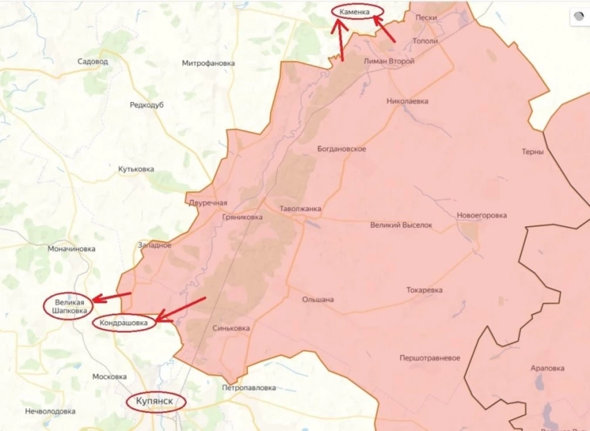 Кроме того, сообщается об успехах армии России у Кондрашовки и Малой Шапковки, где большая часть первого села уже под нами, за вторую идут бои. Значение посёлков трудно переоценить. Их освобождение позволит перерезать стратегическую дорогу Купянск - Большой Бурлук.