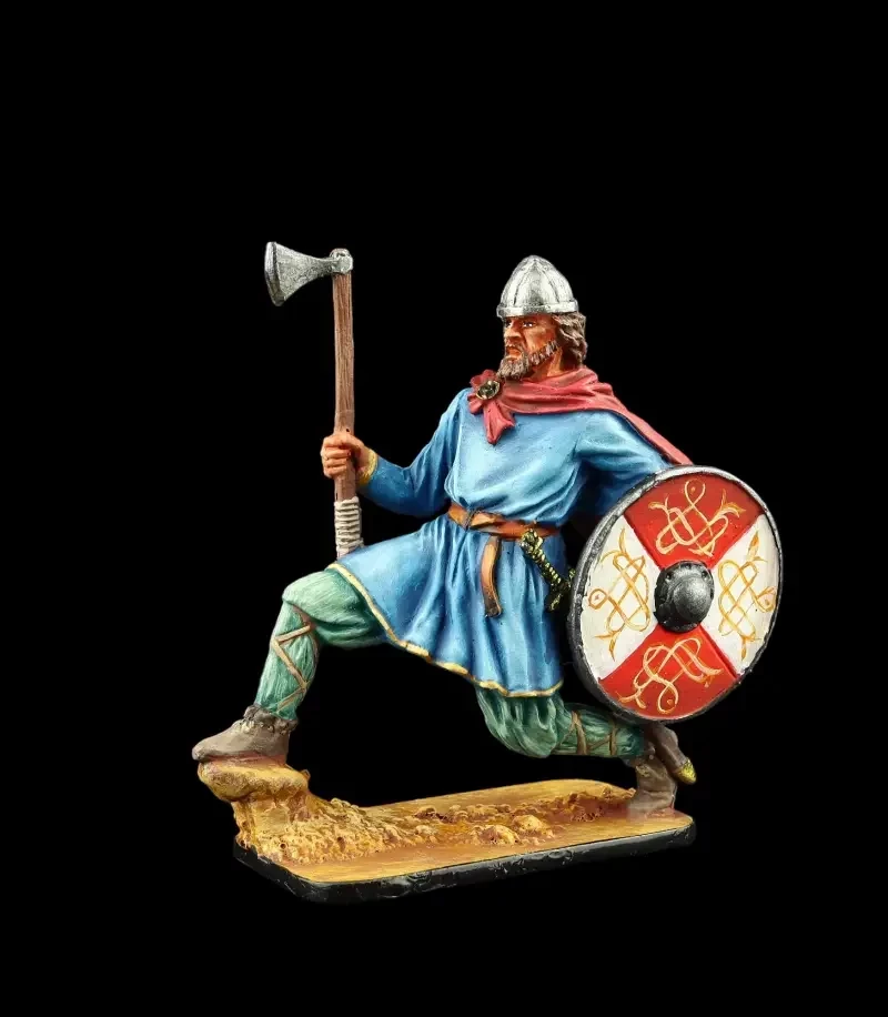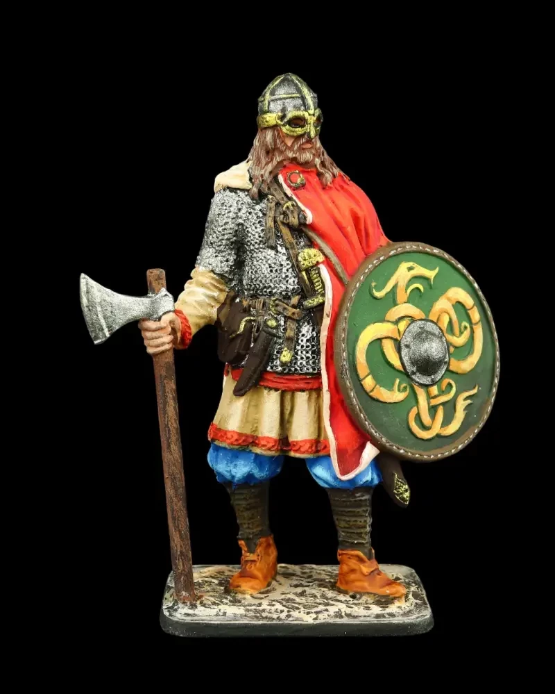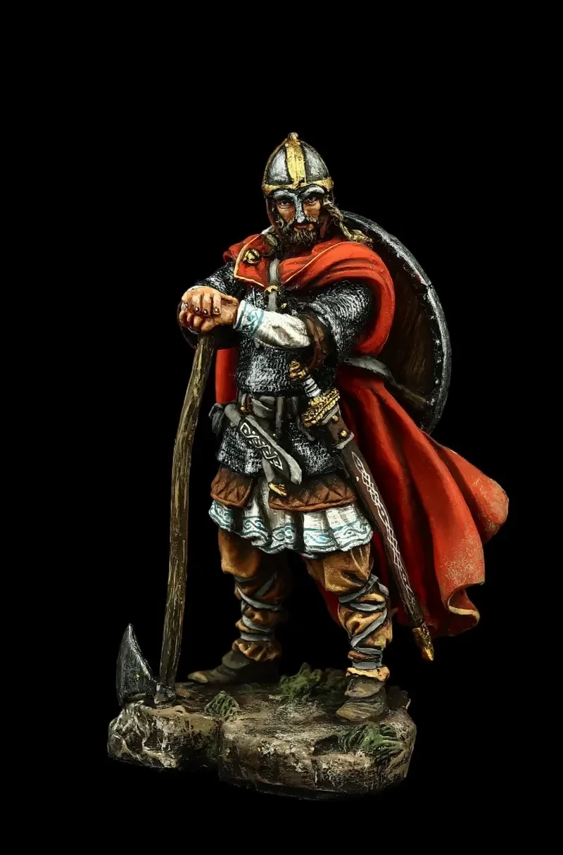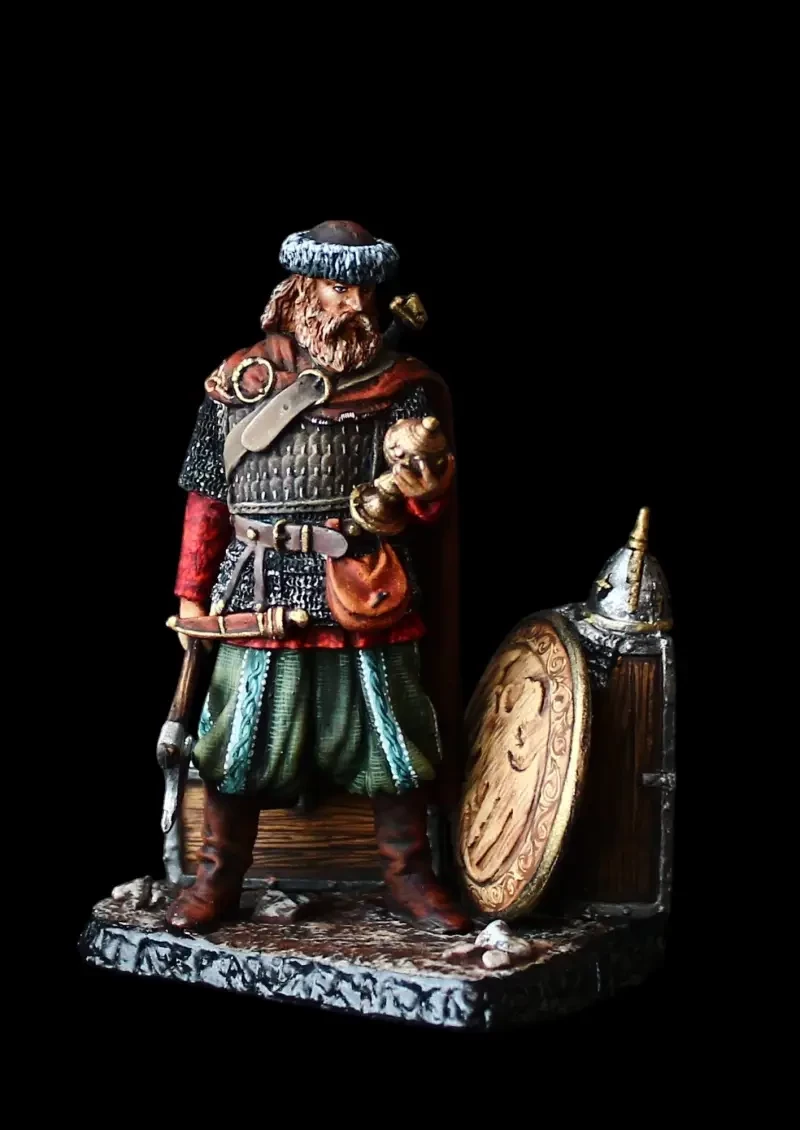 Возможно, что именно так выглядел легендарный Рюрик, ставший в землях славян основателем династии Рюриковичей. На вид типичный викинг, норманн. Одет в кольчугу, а в руках у него топор – излюбленное оружие «северных людей» и шлем с полумаской, склепанный из четырех сегментов. Производители: Silver Dream Studio и «Серебряная Ладья».