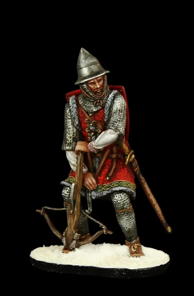 Русский арбалетчик 1242 г. Интересен способ, которым он приводился в действие: лук натягивали двумя крюками на поясном ремне, за которые заводили его тетиву, упираясь ногой в «стремя» на его ложе. После этого можно было вкладывать в него стрелу, прицеливаться и стрелять! Производители: «Silver Dream Studio» и студия «Оловянный Парад»