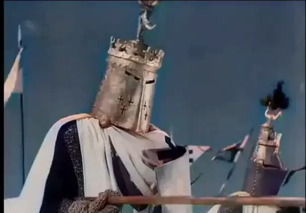 Тевтонский рыцарь в коронованном шлеме, да ещё и с когтистой лапой. Вообще-то, рыцарям-монахам не разрешалось носить на шлемах мирские украшения, тем более разные языческие символы. Но Эйзенштейн явно посчитал, что в данном случае эпичность важнее историчности… Кадр из фильма «Александр Невский»