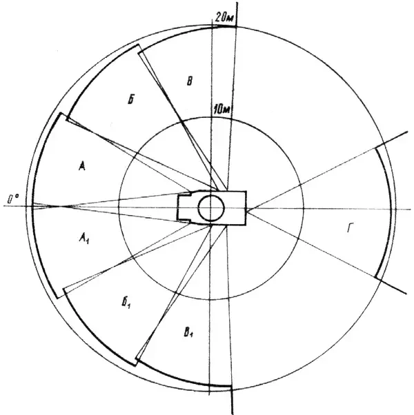 Рис. 2. Зоны обстрела стрелковым оружием: А, А1 — правый (-5...+30°) и левый (+5...-30°) ПКТ; Б, Б1 — правый передний (25. . .60°) и левый передний (-25...-60°) АК; В, В1 — правый задний (57°30'…92°30') и левый задний (57°30'… 92°30') АК; Г — кормовой ( ±27°30') АК
