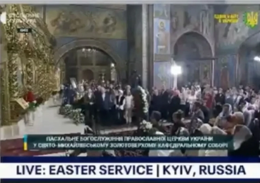 Дело в том, что во время трансляции пасхальной службы из Киева телеканал сопроводил её титрами на английском «Пасхальное служение, Киев, Россия». Позже «ошибку» исправили.