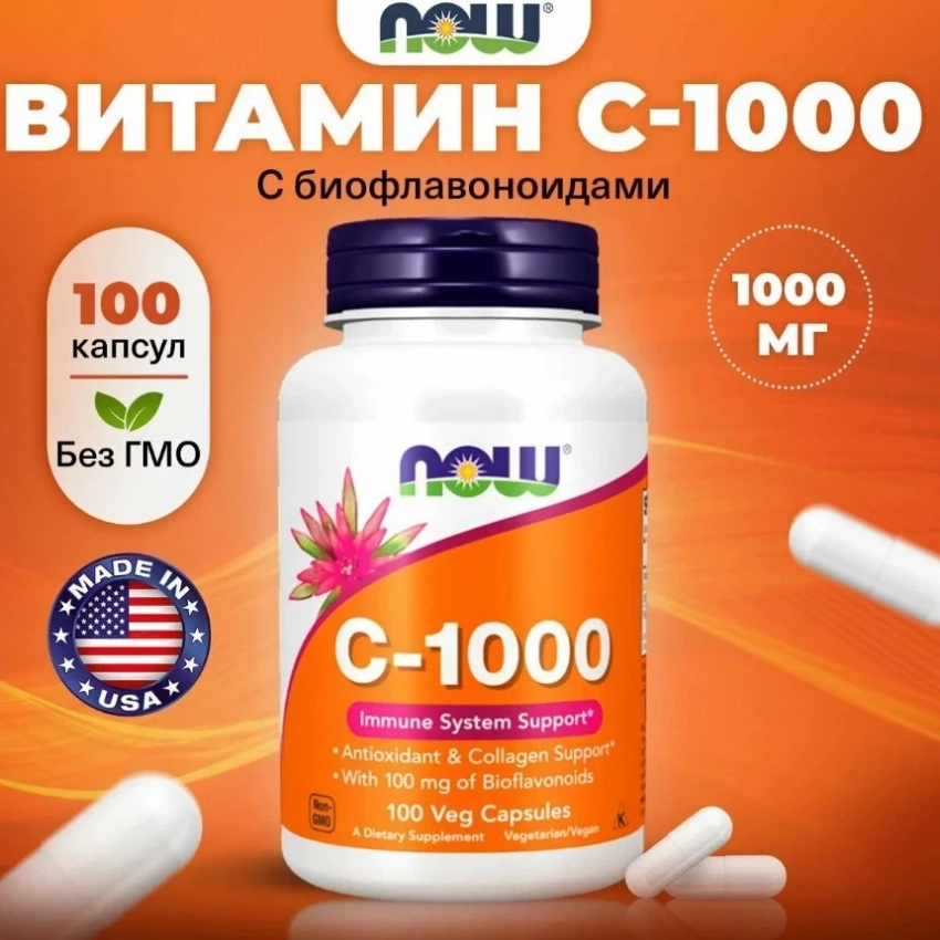 NOW C-1000, Витамин С с биофлавоноидами, 1000мг 100 растительных капсул, Антиоксидант для иммунитета для взрослых, способствуют лучшему усвоению других витаминов