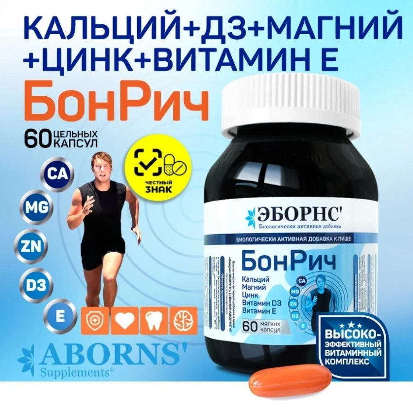 Bonrich ABORNS кальций магний цинк витамин Д3 + витамин Е, капсулы по 1630 мг, ваниль, Calcium+Magnesium Zinc+ Vitamin D3+Vitamin Е