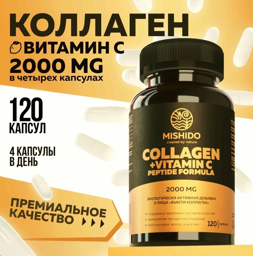 MISHIDO Beauty Collagen — это мощный комплекс, который сочетает коллаген и витамин С, поддерживающий здоровье суставов, кожи, волос и ногтей. Содержание гидролизованного коллагена (2000 мг в 4 капсулах) и витамина С способствует улучшению эластичности кожи, укреплению волос и ногтей, а также улучшению подвижности суставов. Этот продукт идеально вписывается в рейтинг бадов для волос, оказывая комплексное влияние на внешний вид и здоровье. Идеален для людей всех возрастов.