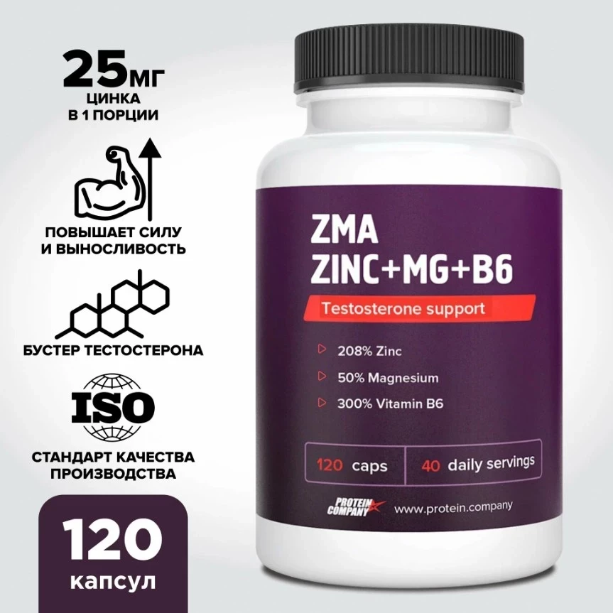 Комплекс ЗМА PROTEIN.COMPANY, ZMA+ Zn+Mg+B6, бустер тестостерона, 40 порций, 120 капсул по 776 мг