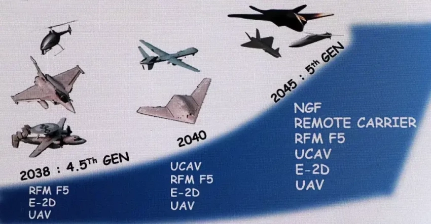 В 2045 году авианосная авиация будет представлена военно-морской версией истребителя нового поколения (NGF). Он будет оснащён собственными дистанционно управляемыми носителями, которые всё больше будут стирать границы между крылатыми ракетами и беспилотными летательными аппаратами и будут наносить кинетические удары, а также нести другие типы полезной нагрузки.