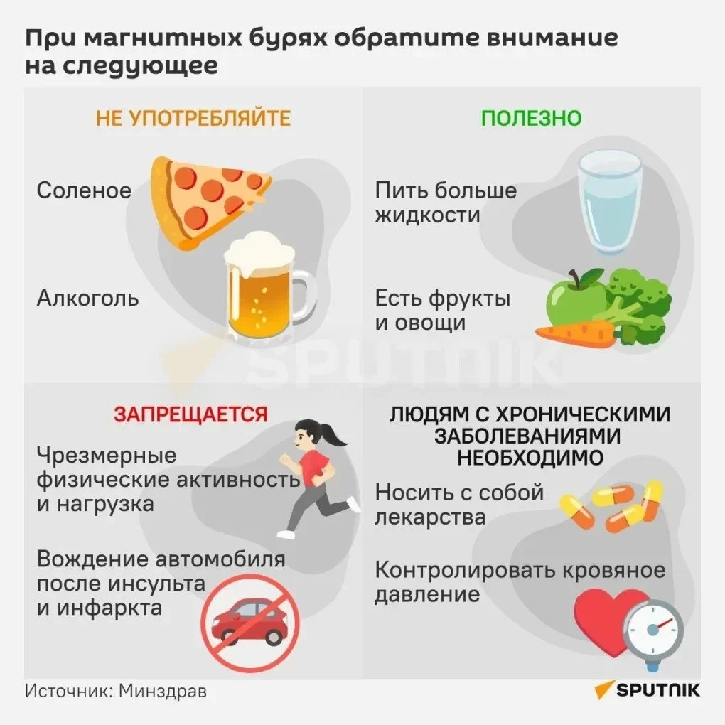 По словам специалиста, в период магнитных бурь у людей с патологиями может развиться гипертонический криз, мозговой инсульт, кровотечение из носа, повышенная психическая возбудимость и бессонница. Это происходит из-за спазма мелких сосудов, что приводит к уменьшению кровотока в тканях. Поэтому в такие дни особенно важно контролировать артериальное давление и пульс.