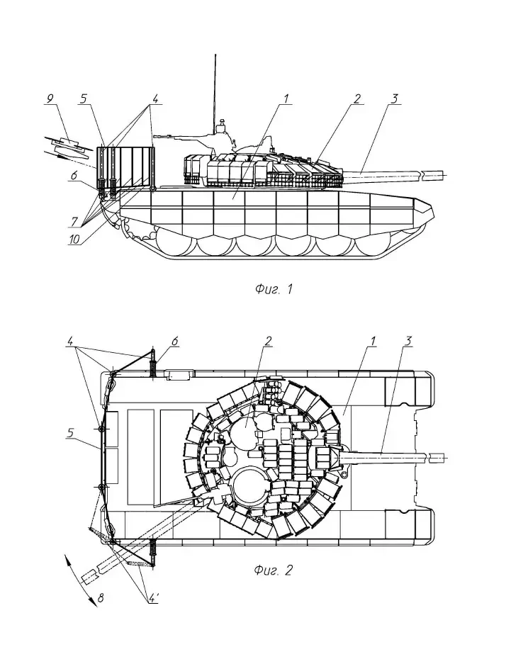 Одним из наиболее уязвимых мест танков является задняя полусфера, и этим очень часто пользуются операторы БПЛА. Для защиты кормы бронированных машин группа специалистов «Уральского конструкторского бюро транспортного машиностроения», среди которых главный конструктор предприятия Андрей Терликов, предложили «дополнительную защиту от атакующих средств поражения бронированного транспортного средства с башней и шасси с задним расположением моторно-трансмиссионного отделения». Это прочный гибкий упругий щиток, нависающий над двигателем, призванный защитить от атакующих средств поражения, например, гранат РПГ, ПТАБ, РКГ-3, ручных гранат Ф-1, в том числе доставляемых на дронах-камикадзе. Они либо отскакивают, либо подрываются на удалении, то есть щиток работает как взводный экран. Заявляется, что отскакивают боеприпасы массой до 3 кг. Нехитрая, прямо скажем, конструкция дополнительно снижает инфракрасную и радиолокационную заметность танка на поле боя. Патент датируется осенью прошлого года, но пока ничего не известно о серийном воплощении.
