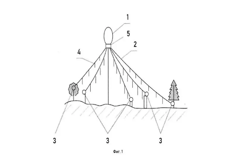 Напоследок отвлечёмся от транспортных средств и посмотрим, как изобретатели предлагают защищать более масштабные объекты. Например, стоянки боевой техники, ремонтные мастерские и даже пункты управления войсками. В одном из свежих патентов (12.02.2025 г.) предлагается поднять в воздух аэростат, прикрепить его канатом к земле и привязать к нему «в различных направлениях нити, отведённые в стороны от центральной оси книзу с образованием конуса».