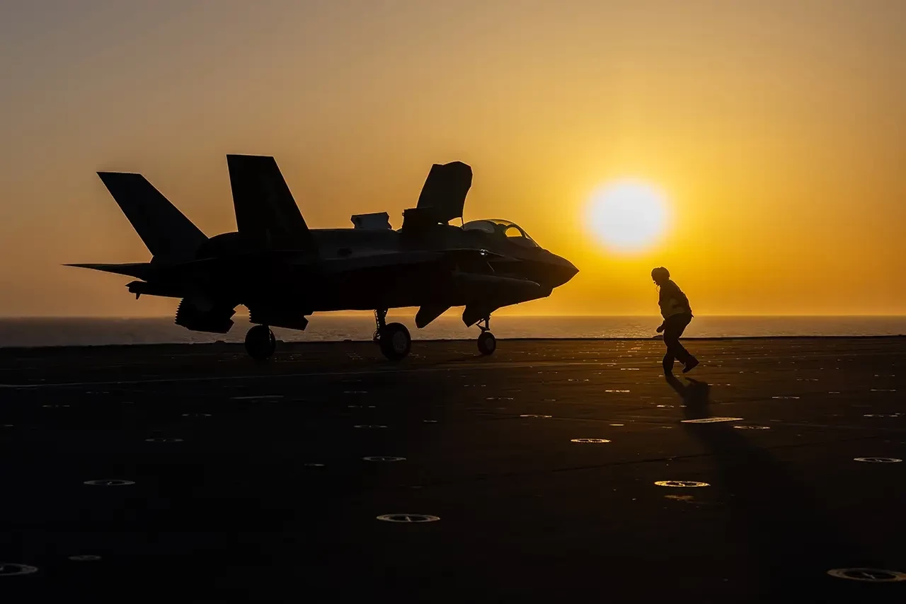 Фото 3. Истребитель F-35B Lightning взлетает с борта авианосца HMS Prince of Wales во время транзита на юг в Красном море, 26 мая 2025 года.