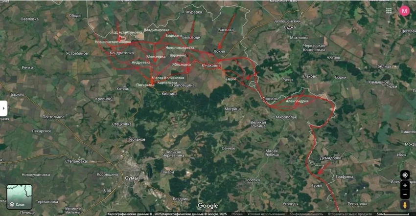 По его словам, активные бои уже развернулись в холмистой местности у Малой Корчаковки. Российские войска медленно, но уверенно продвигаются, стремясь взять под контроль условный «треугольник» Могрица - Большая Рыбица - Мирополье.