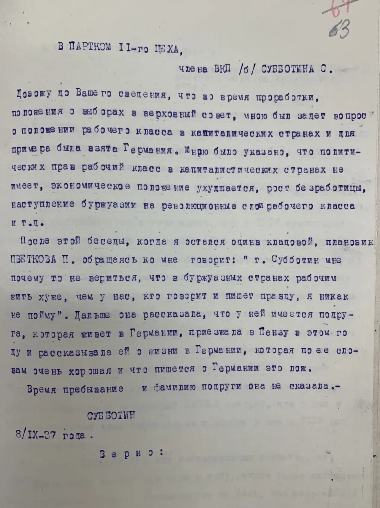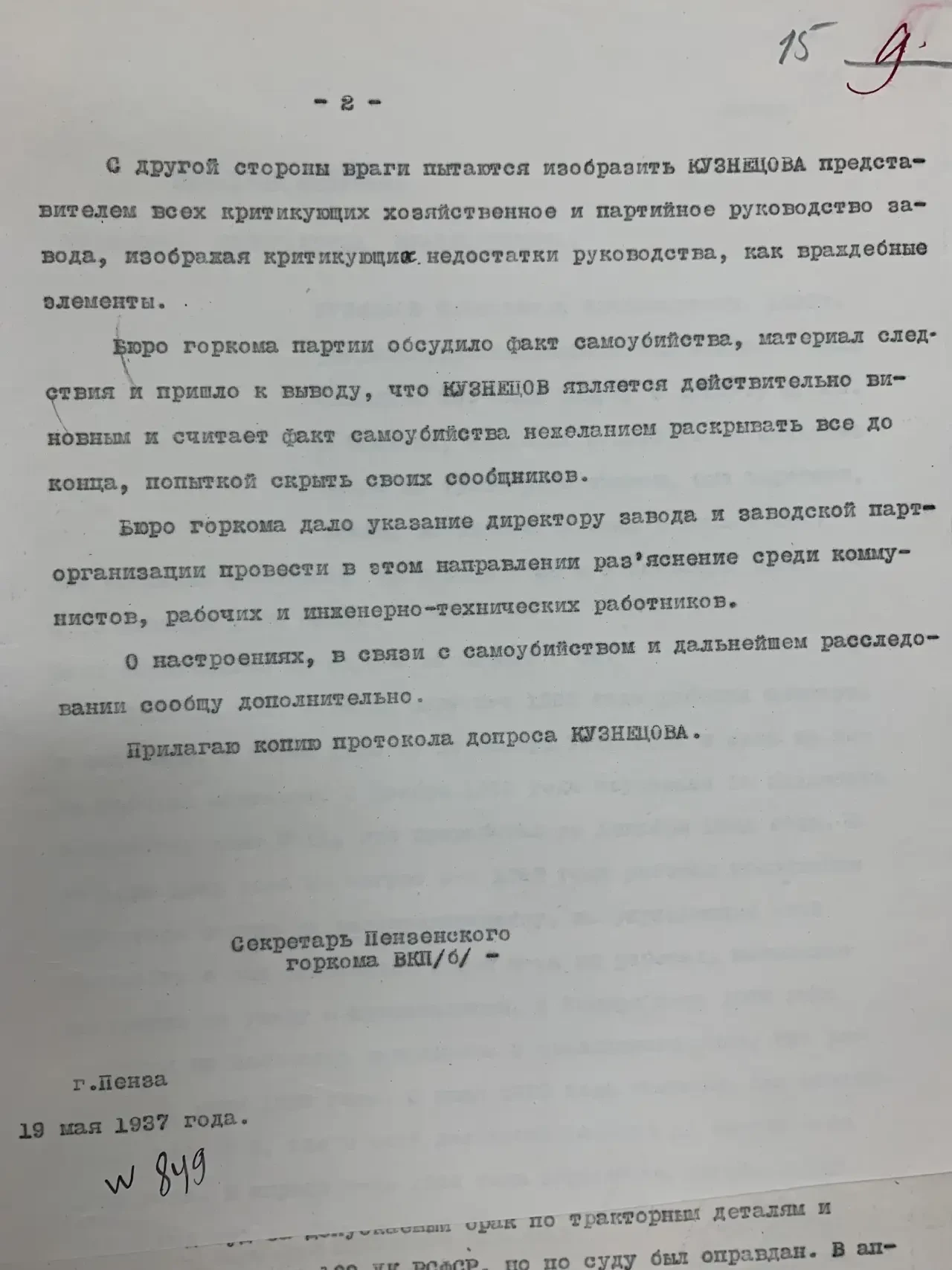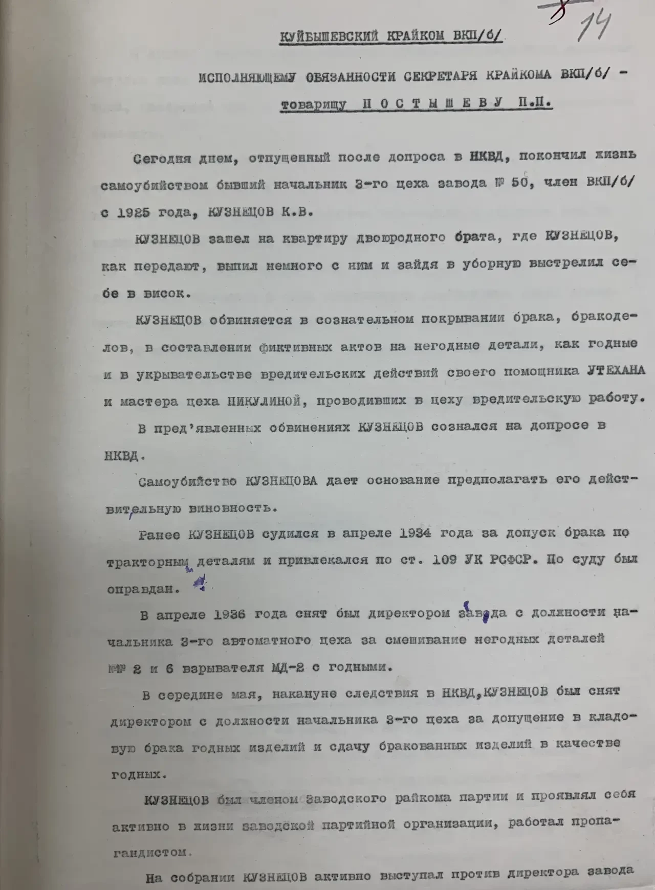 Сегодня днем, отпущенный после допроса в НКВД, покончил жизнь самоубийством бывший начальник 3-го цеха завода № 50, член ВКП/б/