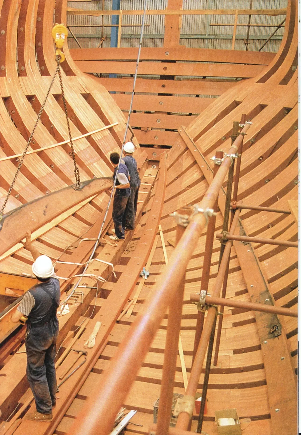Так как приобрести бревна достаточной длины было затруднительно, то киль, шпангоуты и многие другие части корпуса собирались из так называемой «ламинированной древесины», то есть распиленной на тонкие доски, а затем склеенной до необходимых размеров. Следует отметить, что прочность таких «бутербродов» была выше, чем у цельной древесины.