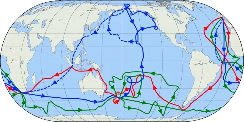 Три путешествия Д. Кука. Красный - маршрут «Индевора»