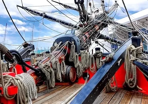 Еще одной проблемой стали стоячий и бегучий такелажи. На судне 18-го века эти троса были пеньковыми, но теперь пенька стала раритетом. Поэтому пришлось довольствоваться канатами из манилы, полипропилена и полиэстера. Потребовалось изготовить более 700 блоков, а также множество других деревянных деталей для такелажа. Огромный объем работ был выполнен и бригадой кузнецов. К моменту спуска судна на воду рангоут и такелаж уже были готовы к монтажу.