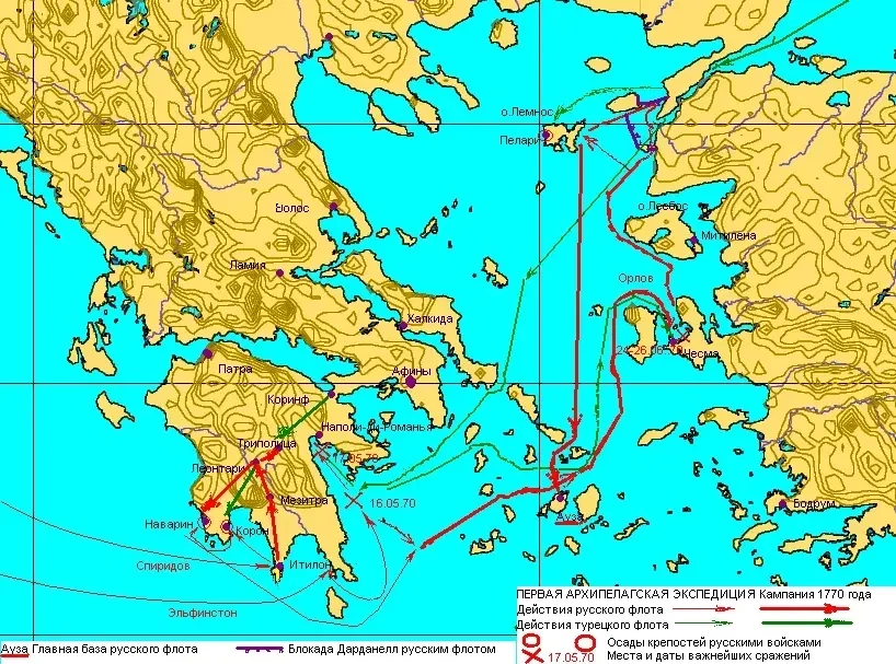 9 (29) мая 1770 года эскадра Эльфинстона прибыла к берегам Мореи. Высадив десант, эскадра двинулась на поиски флота противника, о котором узнали от греков.