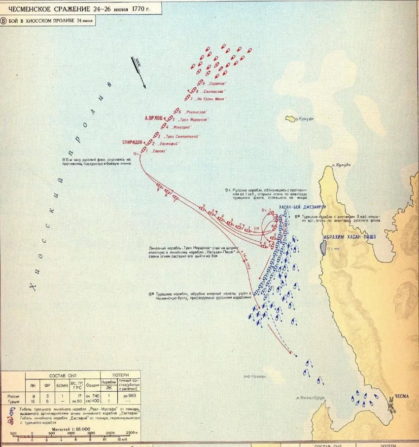 Русский флот в бою Хиосском проливе потерял один линейный корабль. В битве при Чесме русские потери составили всего 11 человек.