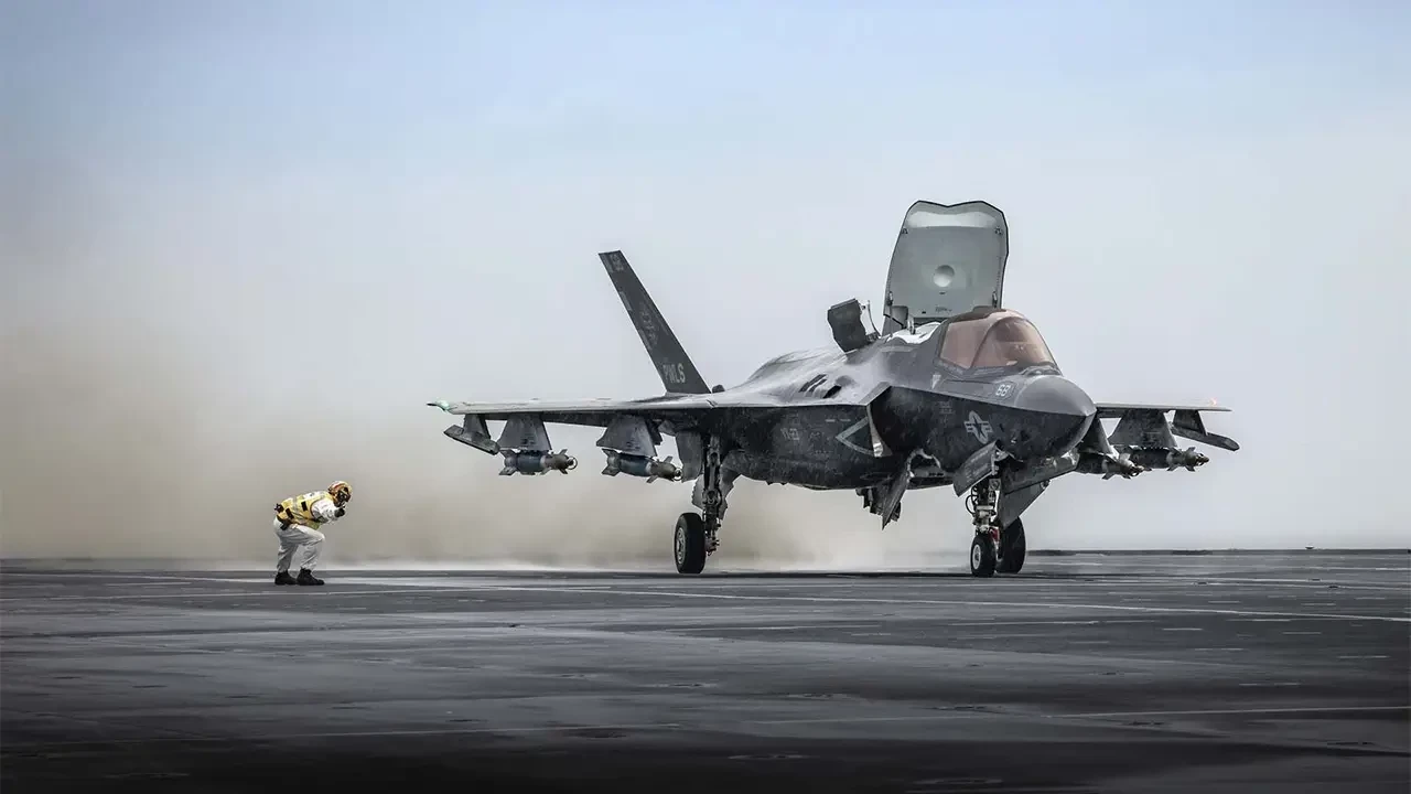F-35B Lightning II из Интегрированной испытательной группы, действующей с борта авианосца HMS Prince of Wales, с внешней подвеской бомб Paveway IV