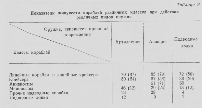 Для того чтобы сравнить живучесть авианосца с живучестью кораблей других классов, воспользуемся «условным показателем живучести», представляющим собою выраженное в процентах отношение числа случаев, когда корабль после нанесения ему повреждений остался на плаву, к общему числу случаев гибели и повреждений кораблей рассматриваемого класса. Соответственные данные помещены в табл. 2. Приведённые в ней показатели основаны на статистических данных Центрального научно-исследовательского института НКСП за первые три года войны и на материалах контр-адмирала В. Ф. Чернышева (показатели по данным В. Ф. Чернышева приведены в скобках).
