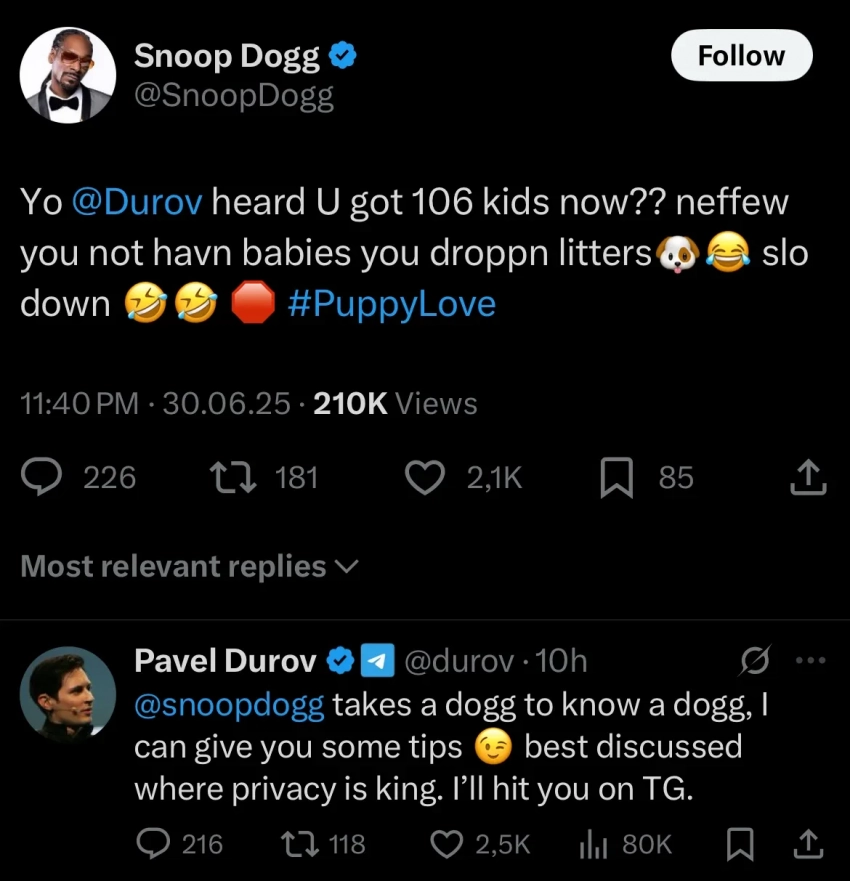 "Слышал, у тебя теперь 106 детей? Братиш, ты не детей заводишь, а плодишь целые выводки щенков, притормози", — написал рэпер. На это 40-летний российский миллиардер ответил рэперу, что "чтобы понять догга, нужно самому быть доггом (dog — собака в переводе с английского языка)", а также сказал, что может дать пару советов Снуп Доггу и предложил пообщаться в телеграме.