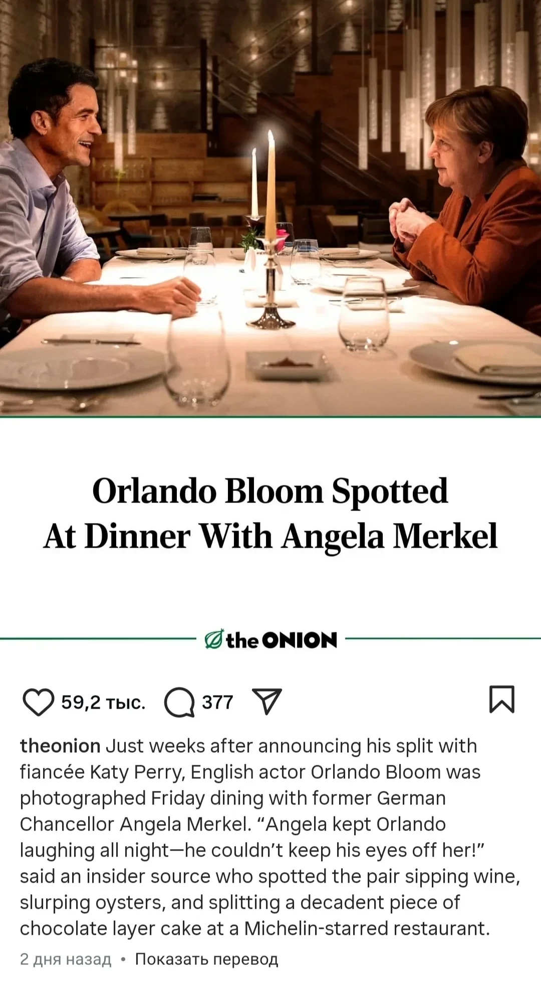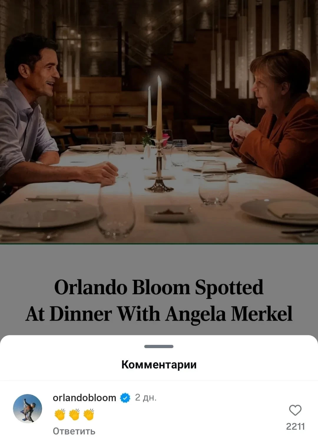 Актёр не смог пройти мимо шуточной новости, вышедшей в сатирическом американском агентстве The Onion. Агентство написало, что сам Орландо якобы на днях сходил на свидание с бывшим канцлером Германии Ангелой Меркель, и даже приложил их фото, сгенерированное искусственным интеллектом. Блум оценил шутку и оставил под постом комментарий с эмодзи в виде аплодисментов.