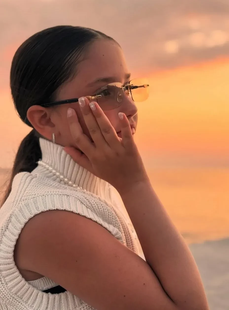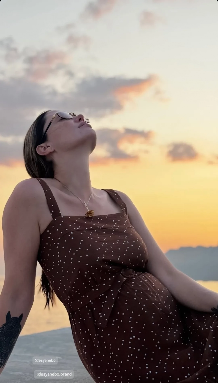Актриса уточнила, что снимки сделала 9-летняя Мия. “Миюшка сфоткала”, — написала она. На кадрах Муцениеце сидит на пляже на фоне заката в коричневом платье в горошек. Один из снимков запечатлел её с рукой на округлившемся животе: актриса ждёт ребёнка от своего жениха Петра Дранги (хотя в сети ходят слухи, что его настоящим отцом является миллиардер Сулейман Керимов).